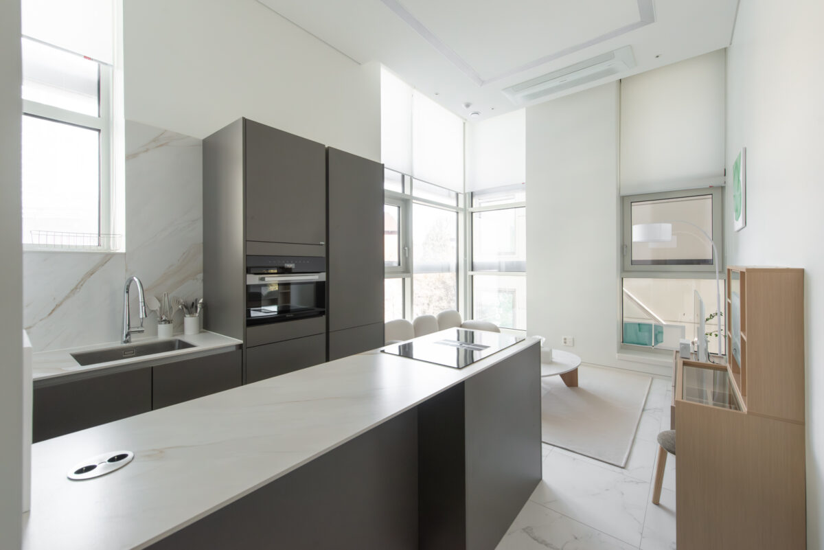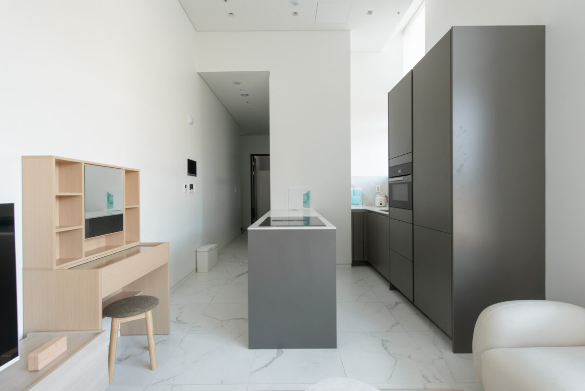This apartment with high ceilings offers a comfortable and thoughtfully designed living space. It features a private bedroom with a spacious wardrobe, a welcoming living area, and a well-equipped kitchen with an island dining table and modern appliances—making the space both practical and comfortable for longer stays. The building also offers stress-free parking with complimentary valet service available for residents.