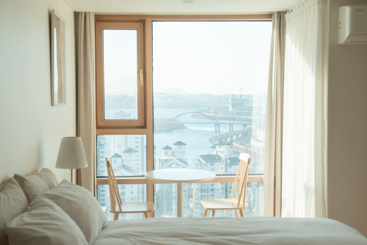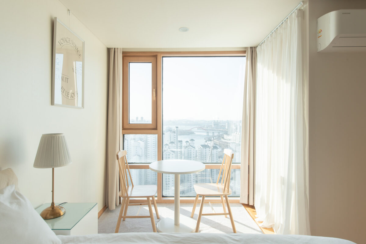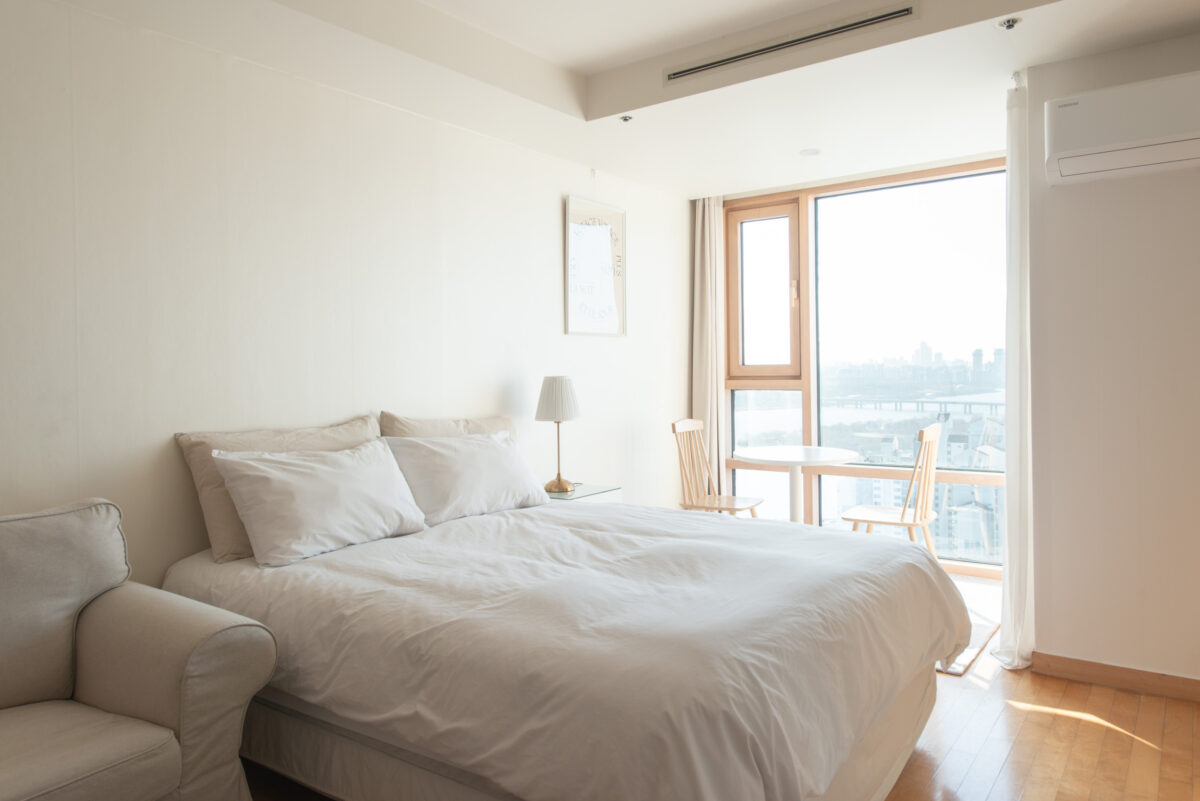 This space features floor-to-ceiling windows with an open view of the Han River. The room is bright and filled with natural sunlight throughout the day.