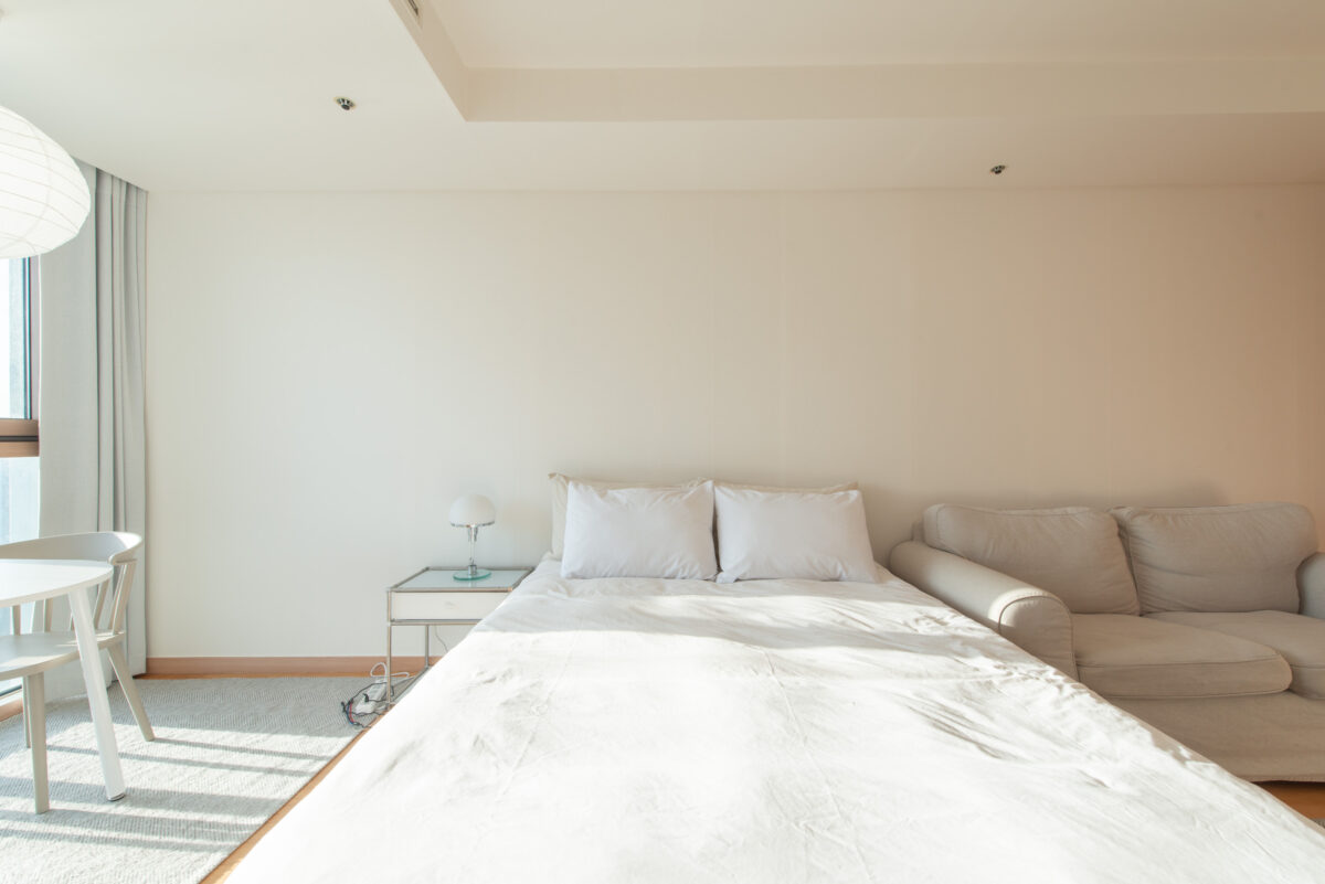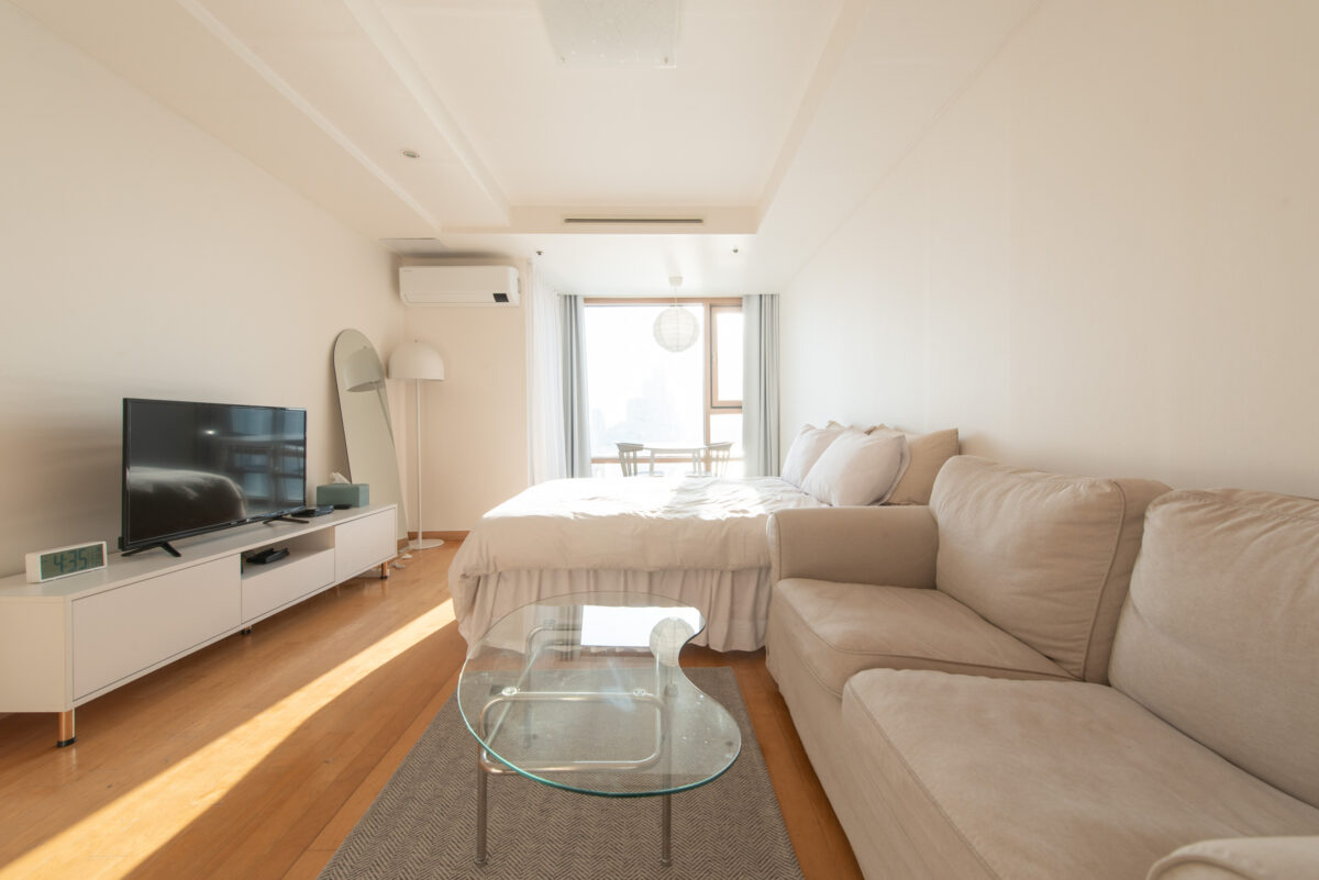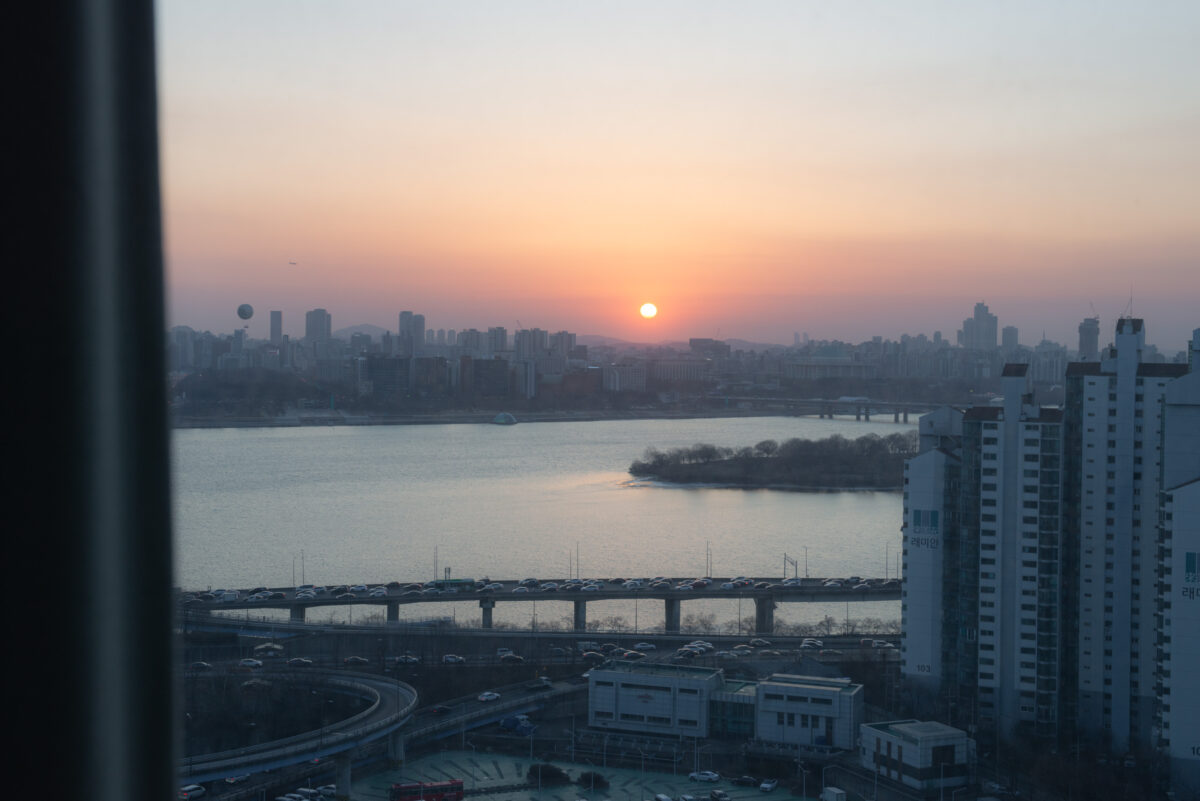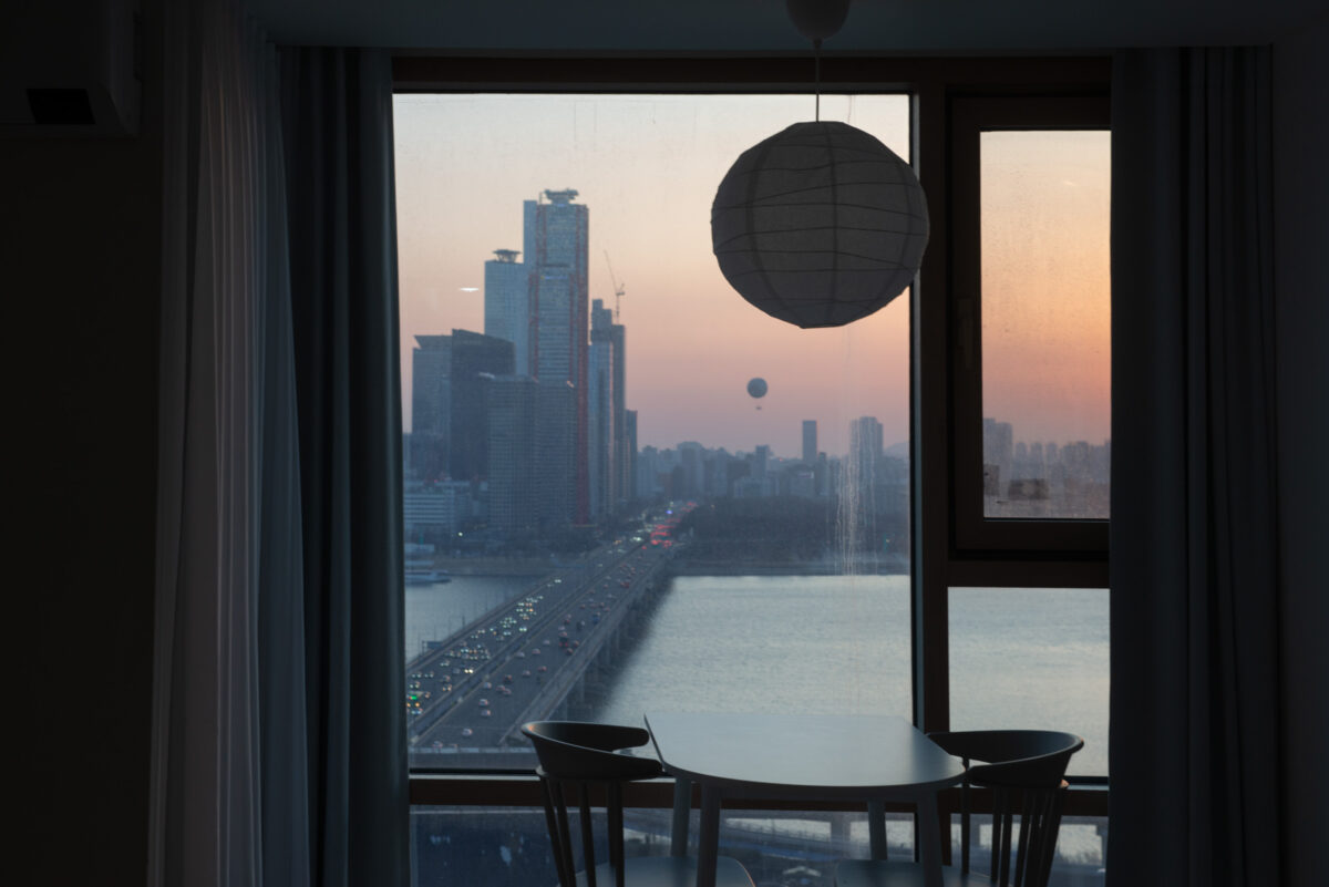 This space features floor-to-ceiling windows with an open view of the Han River. The room is bright and filled with natural sunlight throughout the day.